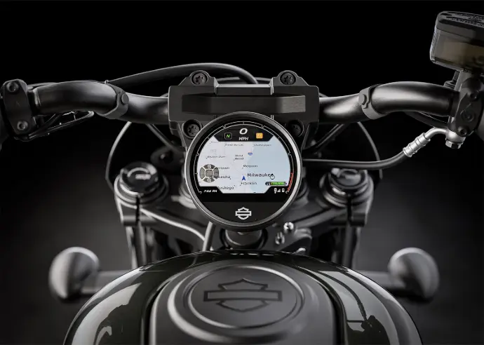 Gauges | 4-inch viewable area TFT display with speedometer, gear, odometer, fuel level, clock, trip, ambient temp, low temp alert, side stand down alert, TIP over alert, cruise, range and tachometer indication BT capable - phone pairing to access phone calls, music, navigation (H-D App ONLY) |
