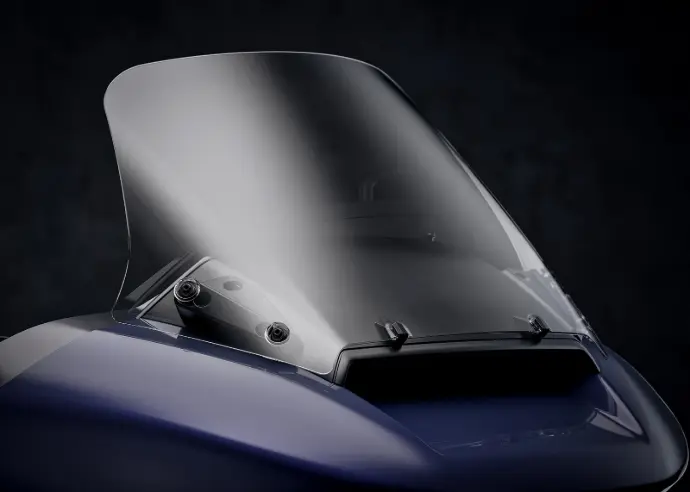 The taller, reshaped wind screen channels airflow cleanly around rider and passenger for smoother miles and less fatigue after those long days on the road. Its new profile flows naturally with the Road Glide Limited’s front end, cutting the wind just enough to stay comfortable without losing the commanding look and feel of the bike.